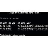 Der Wera 3165 i/6 Schraubendrehersatz Kraftform Plus, Edelstahl + Rack mit VDE-geprüfter Isolation und Lasertip-Technologie besteht aus sechs Schraubendrehern mit Schlitz- und Kreuzschlitz-Profilen. Die Stückprüfung bei 10.000 Volt gemäß IEC 60900 gewährleistet sicheres Arbeiten, auch unter Spannung bis 1.000 Volt. Sie bestehen aus Edelstahl, wodurch der unansehnliche Fremdrost nach dem Verschrauben vermieden wird. Die Edelstahlwerkzeuge von Wera sind vakuumeisgehärtet und verfügen damit über die für Verschraubungen benötigten Härten und Festigkeitswerte. Der industrielle Einsatz ist ohne Einschränkungen möglich. Mittels Laserlichts wird eine scharfkantige Oberflächenstruktur an der Klingenspitze erzeugt. Die Laserbehandlung bewirkt eine Härte der Spuren von bis zu 1000 HV 0,3. Die microraue Oberfläche beißt sich im Schraubenkopf fest, sorgt für sicheren Sitz des Schraubendrehers in der Schraube und verhindert das Herausrutschen aus dem Schraubenkopf. Mit dem von Wera entwickelten mehrkomponentigen Kraftform-Griff findet die ganze Hand Kontakt zum Griff. Die glatten, harten Zonen gleiten beim Umgreifen wie Räder durch die Hand und ermöglichen besonders hohe Arbeitsgeschwindigkeiten. Die griffigen, weichen Zonen sind optimale Anlageflächen für die Hand und ermöglichen hohe Kraftübertragung. Die Griff-Kennzeichnung mit Schraubensymbol und Griffgröße sorgt außerdem für leichteres Auffinden in der Werkzeugtasche und am Arbeitsplatz. Der Schraubendreher-Satz wird mit Rack geliefert, das an der der Wand befestigt werden kann. So ist eine ordentliche Aufbewahrung und schneller Zugriff gewährleistet.